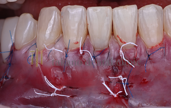 ほぼ全てのケースで行うことができます。上あごから結合組織(歯ぐき)を採取して移植するので取れる歯ぐきの量によっては1度で全てを治療できないことがあります。その場合歯ぐきが再生するのを待って何度か手術を行うことで改善していきます。
